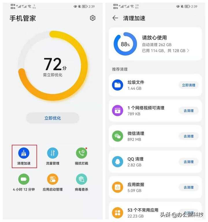每一个手机都会有自带的管家,首先我们打开手机管家,点击【清理加速】,稍等片刻后,系统就会帮你扫描出手机建议清理的内存垃圾,然后我们逐个清理就可以了。