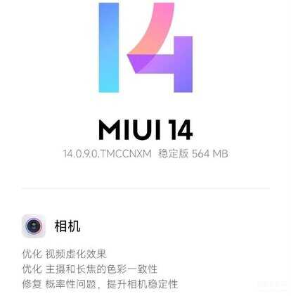 从米粉提供的更新包页面可以看出,本次更新的版本为MIUI 14.0.9.0TMCCNXM稳定版,而更新包的大小为564MB,从更新页面可以看出,本次更新,主要针对相机问题,提升了相机的稳定性,修复了一些参数,具体为: