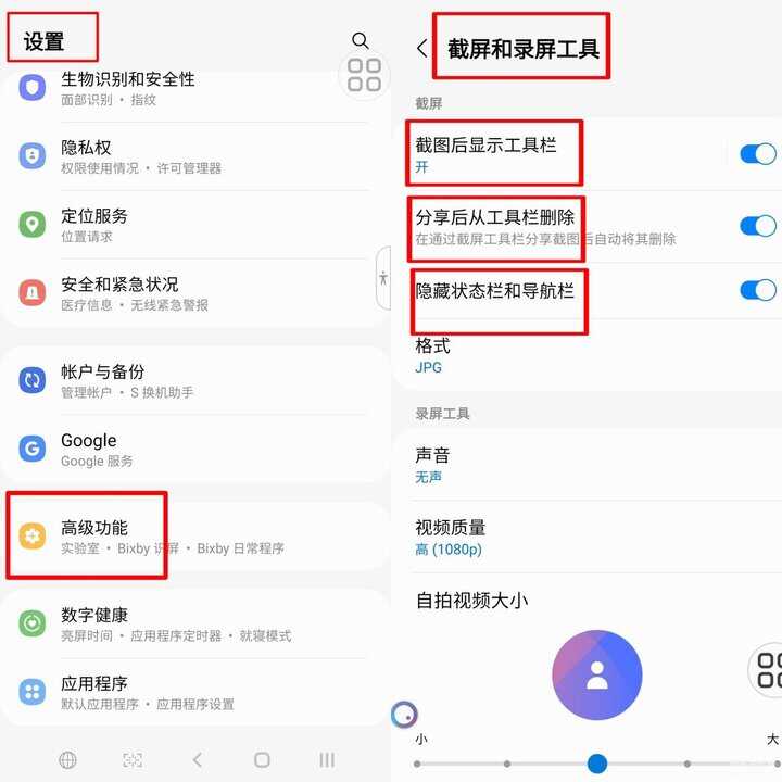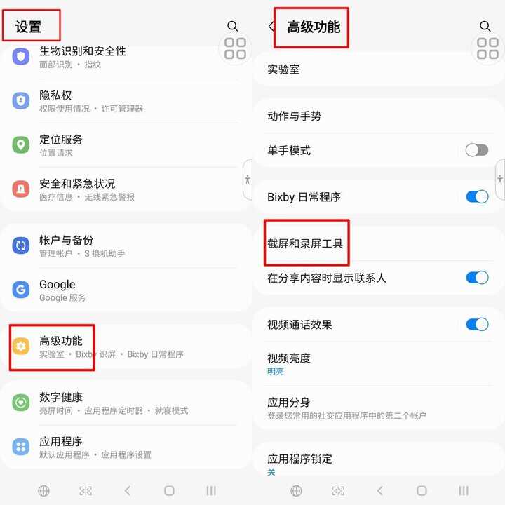 拿出你的三星手机,打开设置,进入高级功能,选择【截屏和录屏工具】,就能对截屏功能进行细节设置啦!