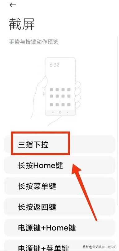 第五步:选择需要的快捷方式,有三指下拉,长按Home键,长按菜单键,长按返回键,电源键+Home键等等。不过个人觉得“三指下拉”这个快捷方式使用起来最为方便。