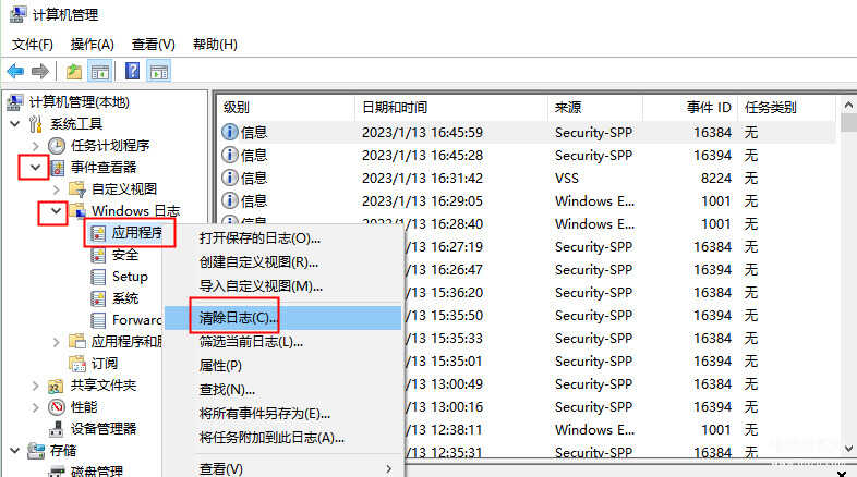 第二步:依次点击【事件查看器】-【Windows日志】,选中【应用程序】并按下鼠标右键,选择【清除日志】。
