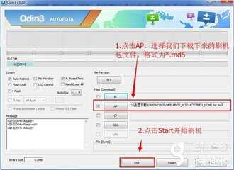 4、在AP按钮处选择我们下载下来的刷机包文件,一般ODIN刷机包格式为*.md5,选择好以后点击Start开始刷机。