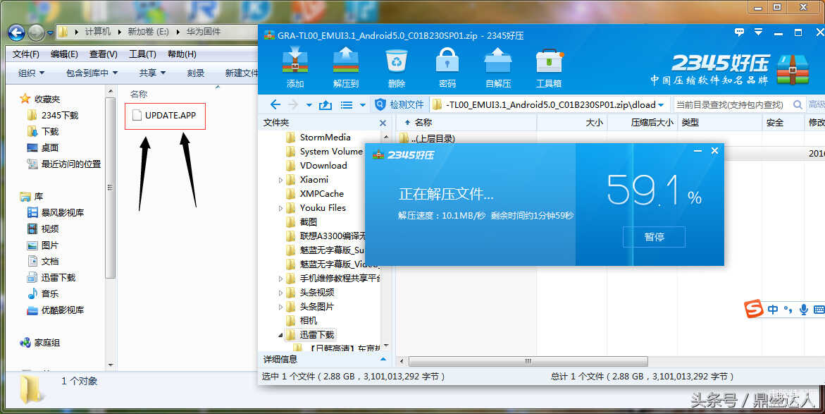 第一步:解压下载好的华为官方卡刷包,提取update.APP卡刷包。