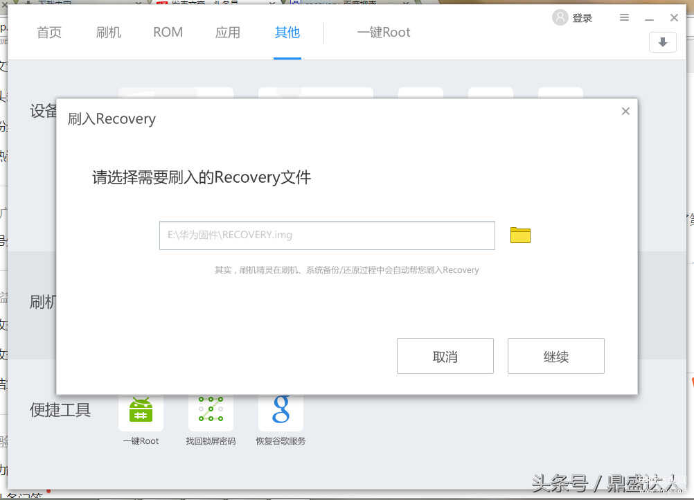 调入刚才我们解压好的 recovery.img文件,点击继续,就可以刷入官方的recovery刷机系统。