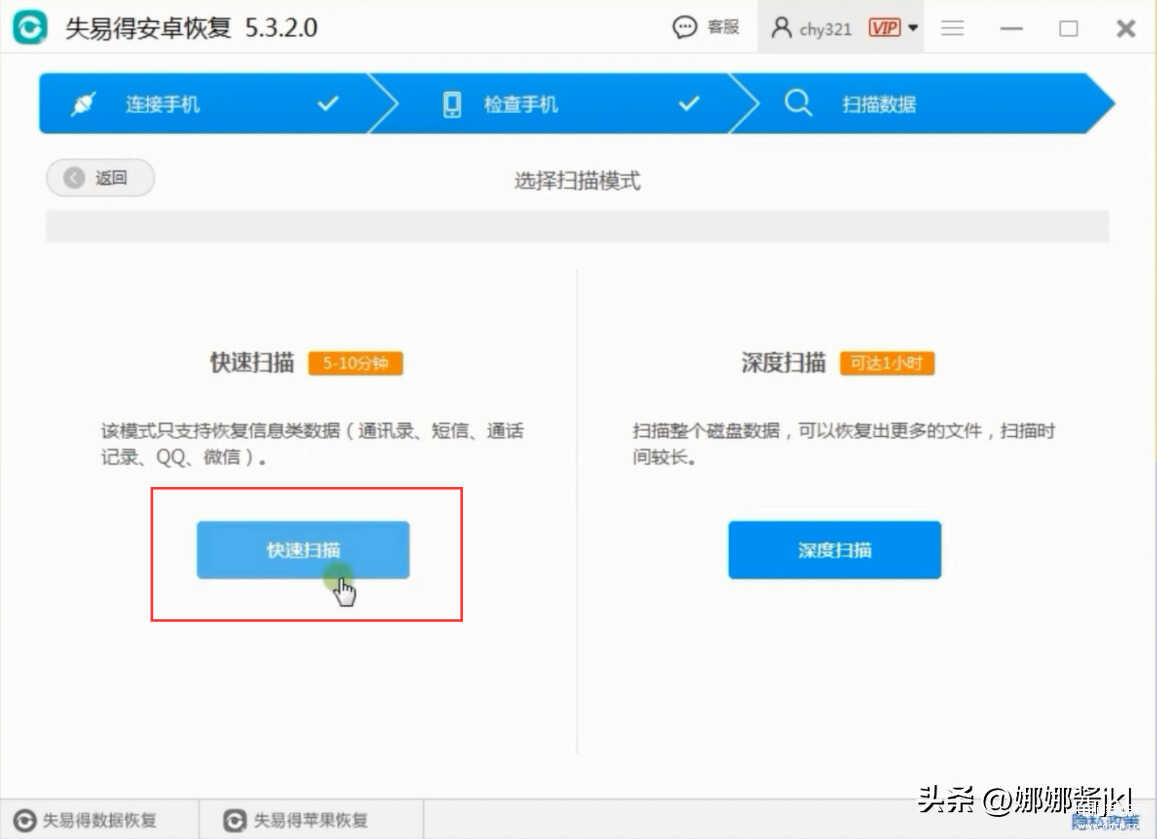 开始扫描后,简单的演示,可以选择快速扫描,不过还是建议大家选择深度扫描。