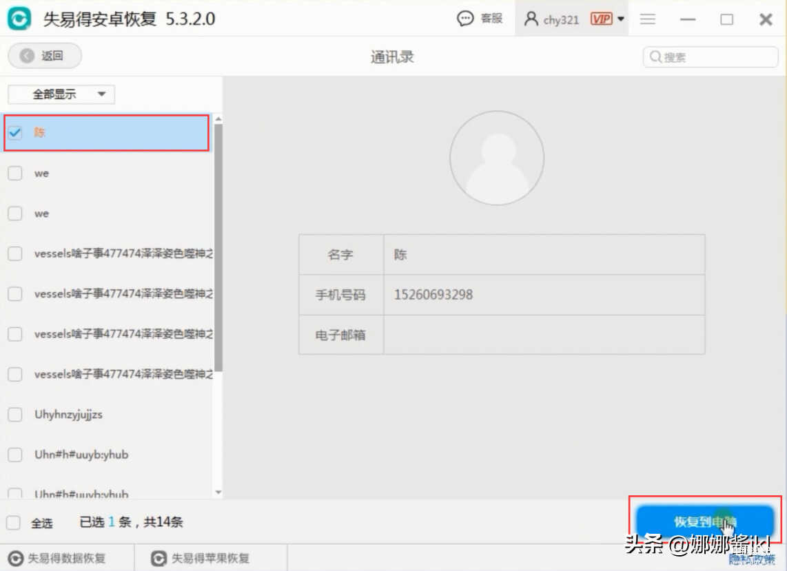 数据扫描完成,预览后,选中要恢复的数据,点击恢复到电脑,
