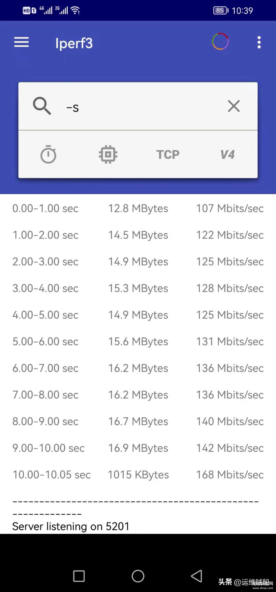 在客户端上使用同样的方法进入到iperf3里,输入"-c 服务端ip地址",比如"-c 192.168.1.100",键盘确认,这样就可以看到我们的传输速率(Bandwidth)了。除此之后,也可以通过与电脑上的iperf3搭配测试网络速度,感兴趣的朋友可以自行尝试一下。