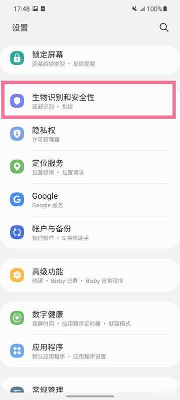 1、点击三星手机的设置菜单,选择生物识别和安全性。
