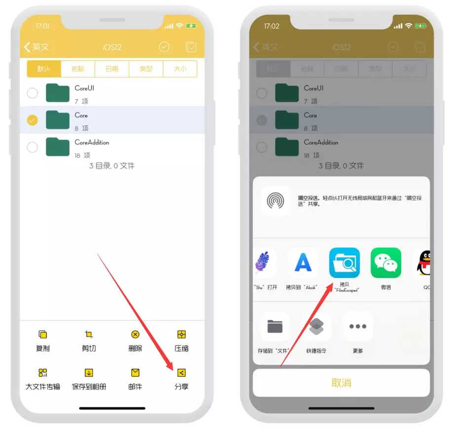 把里面Core,CoreAddition,CoreUI,三个文件依次用复制粘贴的方法进行备份,备份完成后我们返回解压专家在英文文件夹里找到Core,CoreAddition,CoreUI修改字体文件夹,例如:选择Core文件夹点击分享按钮发送到FilzoEscaped,其他两个文件夹依次发送(不可批量发送)。