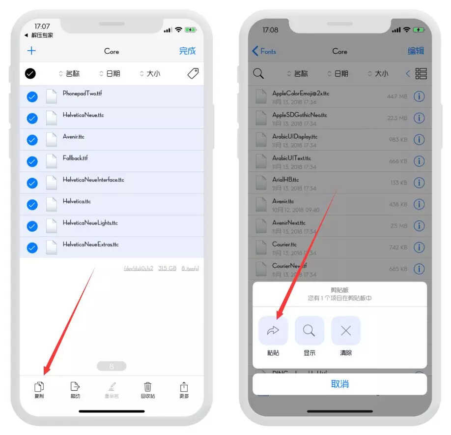 选择进入对应的文件夹,例如:Core文件夹,进入后点击左下角的粘贴按钮,选择粘贴替换所有文件,其余两个CoreAddition与CoreUI文件夹以同样的方式替换文件,返回主屏幕手动重启手机即可完成修改。