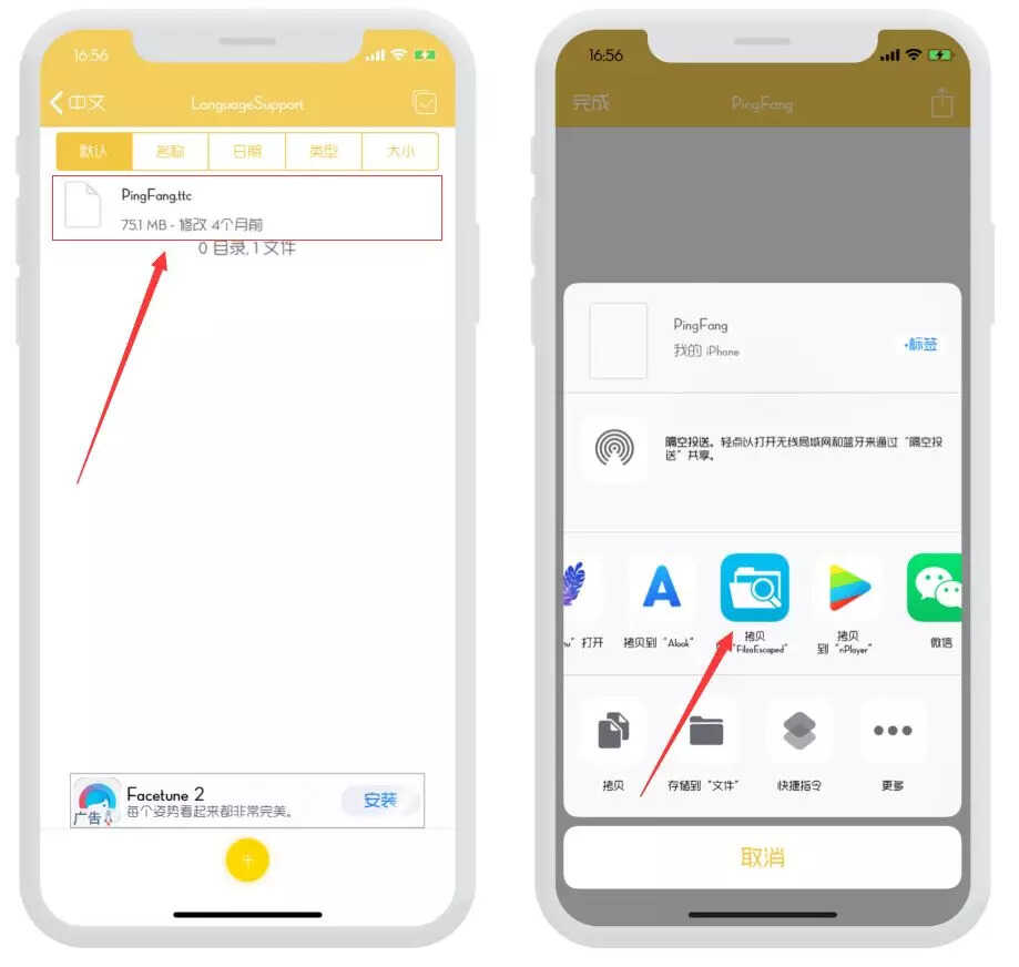 在文件夹内选择中文找到PingFang.ttc文件,点击文件选择分享按钮把文件发送到FilzoEscaped。