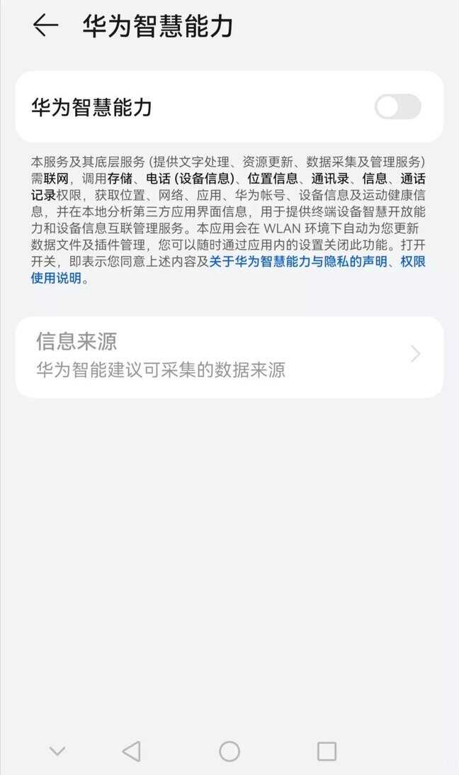 不得不再次摸索起来,找到设置—系统,下滑看到一个“华为智慧能力”,点击进去关闭,我现在是只要有华为智慧字样就要瞅一眼,通通关闭了。
