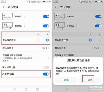 切换两张手机卡的上网流量同样在【双卡管理】页面进行设置,首先将底部的【启用双卡4G】打开,然后在【默认移动数据】选项根据自己的需求选择“卡1”或“卡2”,点击【切换】即可。