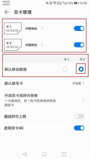 就会进入以下“双卡管理”页面,我们可以看到在顶端会显示有卡1和卡2分别是什么卡,比如下图绿豆这部手机的卡1为电信卡,卡2为移动卡。然后往下看【默认移动数据】的栏目,可以看到此时选中的是卡2,由此就可以知道现在正在使用的是卡2也就是移动卡的流量啦。