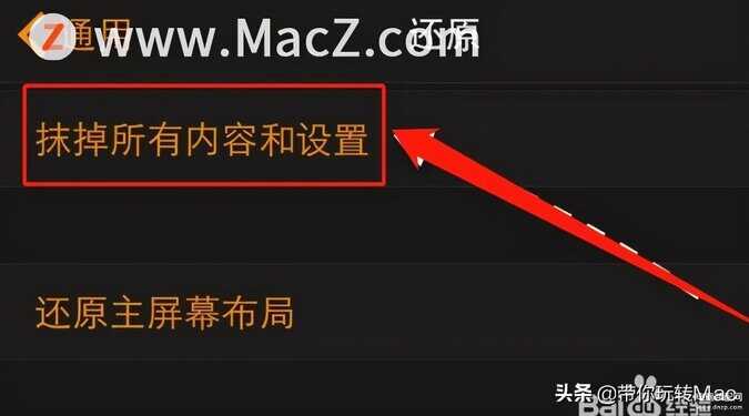 随后在“还原”列表中,点击“抹掉所有内容和设置”。