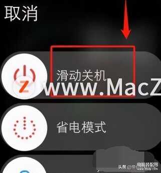 接下来一直按着Apple Watch右侧的侧边按钮,直到屏幕出现关机滑块。