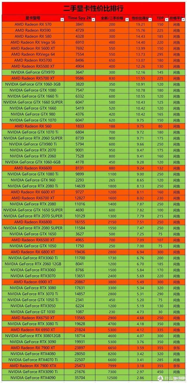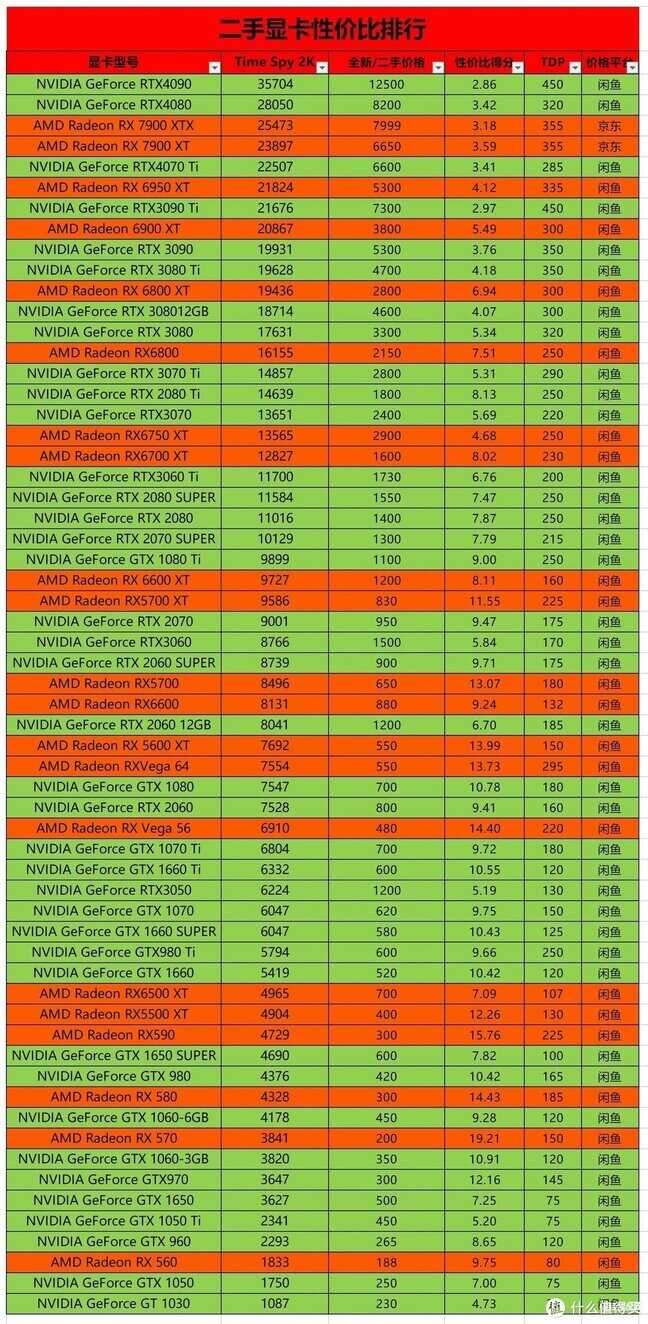 - 显卡价格是23年1月初遍历闲鱼及各大平台所选择的,不排除你能捡漏,价格暴降暴涨等因素导致的价格失效等问题,同时你也可以根据公式自己测算性价比得分,代入到我的表格中,看看你的价格是否合适。