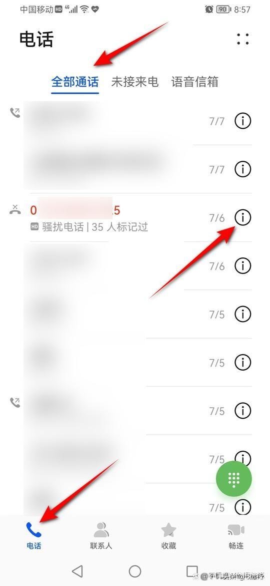 打开来电电话列表,点击需要拉黑的来电号码旁的带圈小感叹号图标。