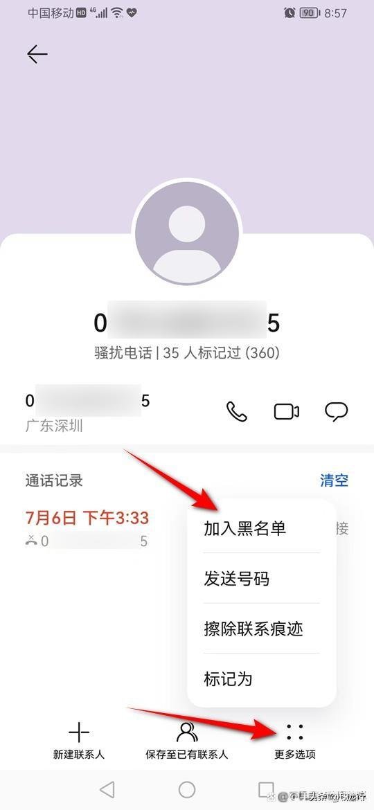点击“更多选项”-“加入黑名单”即可将该手机联系人加入黑名单。