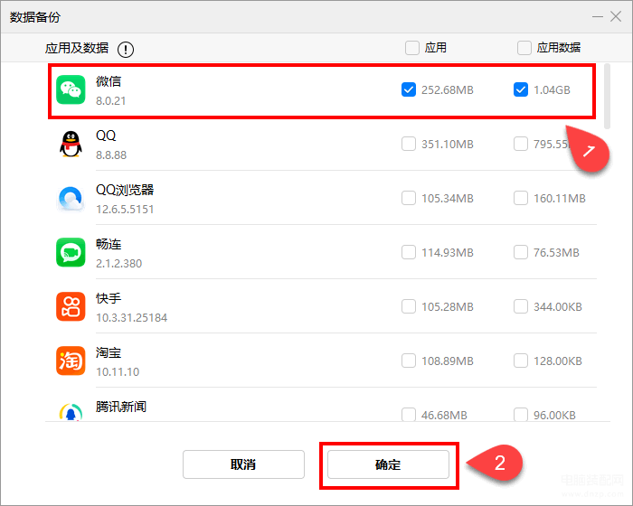 4,记住上方的备份路径,也可点击后方的修改按钮来修改该备份路径,接着点击下方的“应用及数据”。