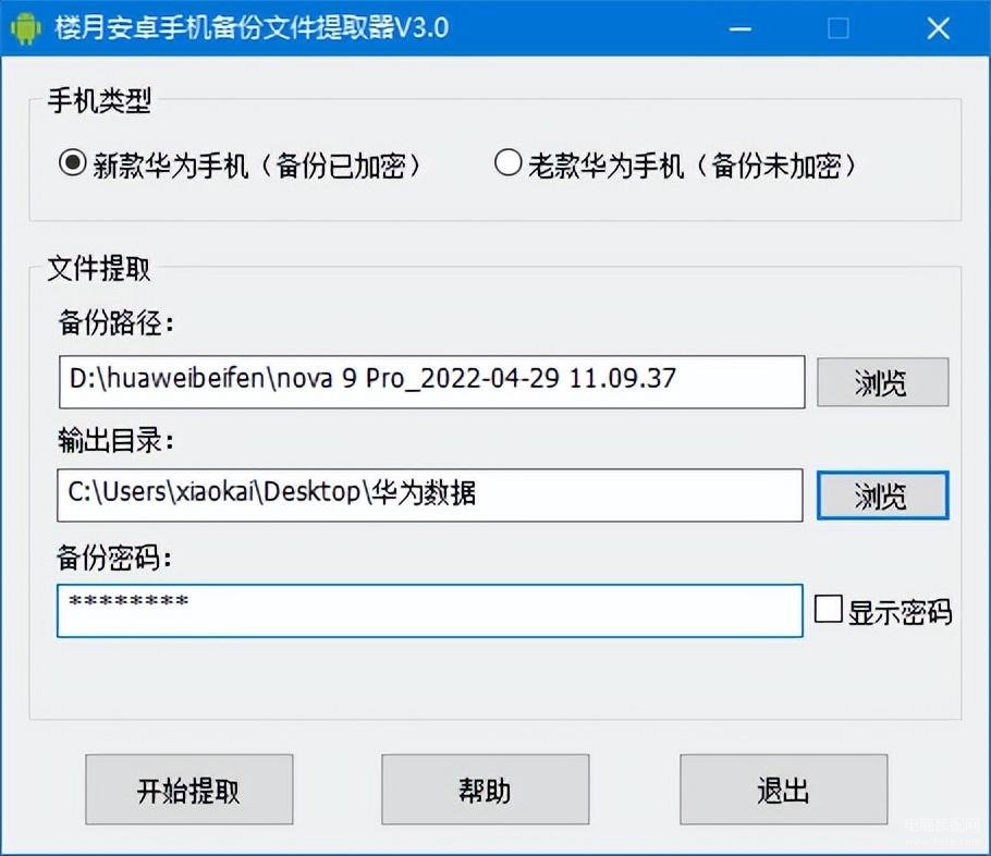 8,在电脑上安装并运行“楼月安卓手机备份文件提取器”,手机类型设置为“新款华为手机(备份已加密)”,备份路径设置为刚才备份好的手机数据所在路径,输出目录则设置一个保存输出文件的路径,备份密码则设置为之前备份时设置的密码,设置好后点击“开始提取”按钮,待其提取结束后,将该软件关闭。