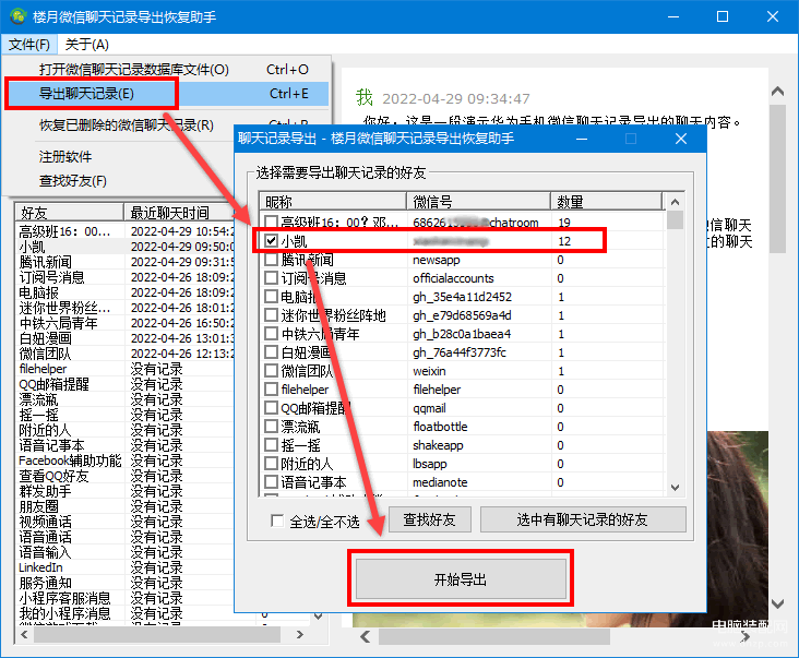 14,也可以点击“文件”,“导出聊天记录”菜单,勾选上一个或多个好友(或群聊),然后可以将聊天记录快速批量导出来。