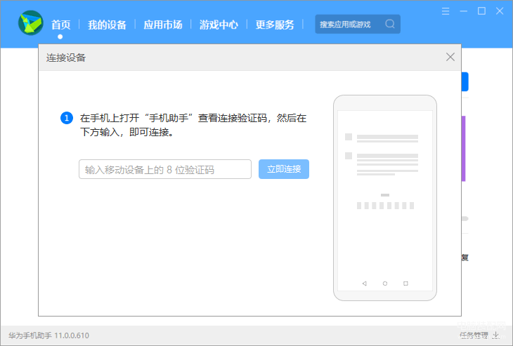 2,在电脑上安装并运行“华为手机助手”软件,按提示输入手机上显示的验证码进行连接。