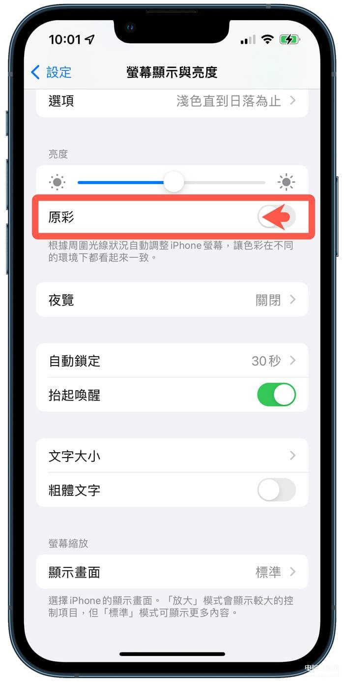 iPhone原彩功能设定位置:iOS【设定】>【屏幕显示与亮度】就能找到原彩开关。