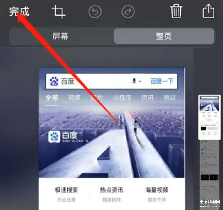 正常截取一个手机屏幕画面后,进入图片编辑状态,点击右上角的“整页”。 右侧可以看到长图的缩略图。