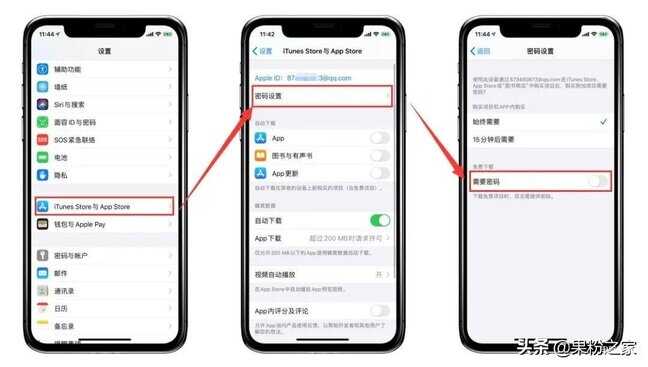 接着再打开「设置」-「iTunes Store与App Store」-点击Apple ID下面的「密码设置」-将「需要密码」按钮关闭即可。