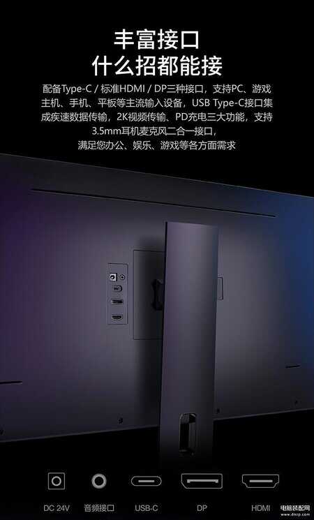 显示器接口方面,配备一个USBType-C、一个标准HDMI和一个DP三种接口,支持PC、游戏主机、手机、平板等主流输入设备。3.5mm耳机麦克风二合一接口满足办公、娱乐、游戏等各方面需求,且内置双扬声器,无需外接音箱。