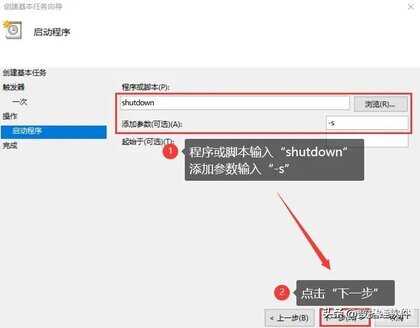 步骤7:在【程序或脚本】输入【shutdown】。输入【-s】在【添加参数】里面,继续【下一步】;