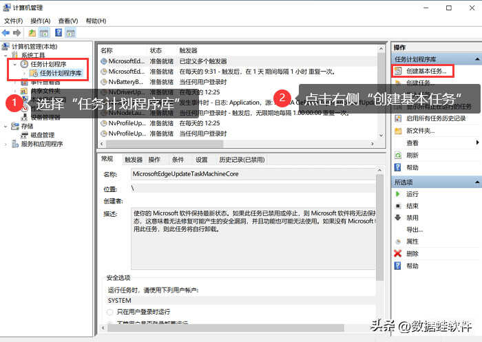 步骤2:在打开的窗口,找到并单击【任务计划程序库】。然后在界面右侧单击【创建基本任务】;