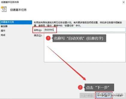 步骤3:在【名称】的输入框里,输入【自动关机】(也可以输入其他的任意名称),单击【下一步】;