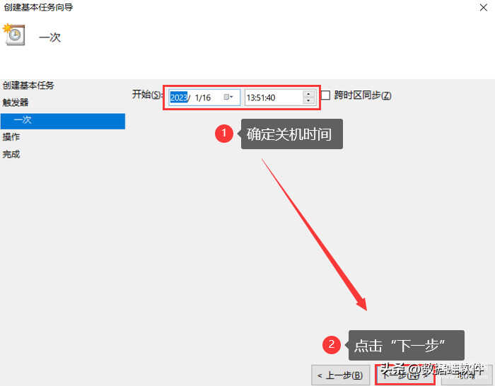 步骤5:接着是确定电脑关机的时间,比如图片上的【2023年1月16日13点51分40秒】,单击【下一步】;