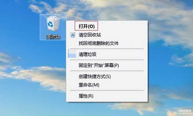 步骤1:进入桌面可以看到回收站图标,双击鼠标左键或者右键选中回收站选择打开。