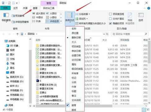 步骤2:打击回收站管理界面以后,如果回收站文件过多,在查看选项下是可以按文件类型、时间、大小等进行筛选找到需要还原的文件。