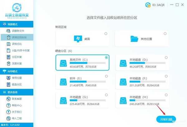 步骤2:接着自由选择扫描的位置,如C盘、D盘、F盘等,根据文件丢失位置进行选择,然后点击“开始扫描”。