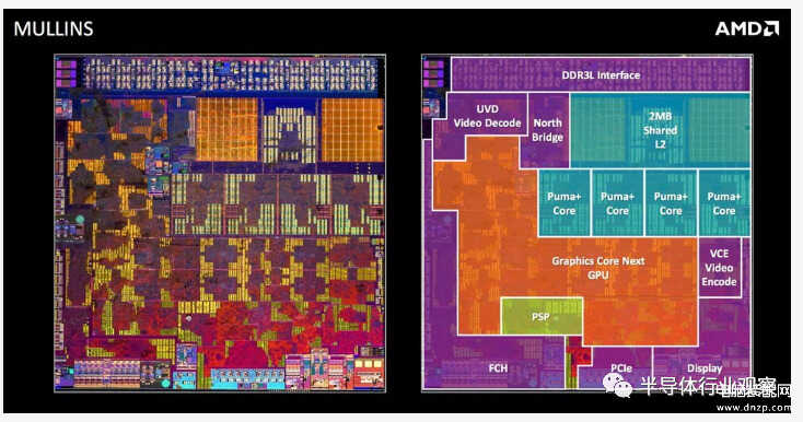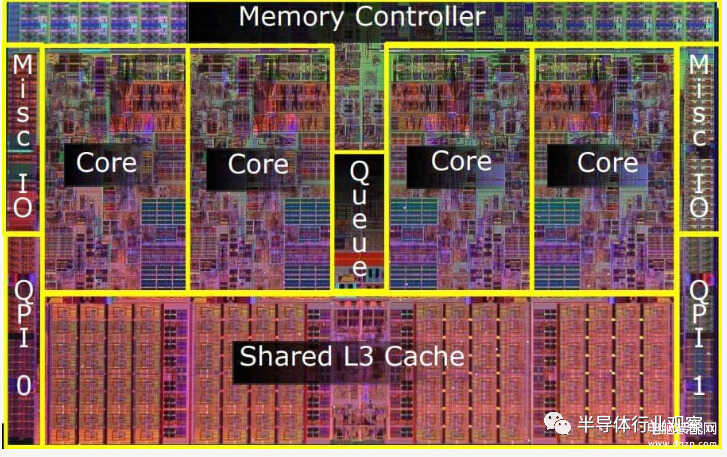 下图显示了几年前的Intel CPU。大部分空间被内核和缓存占用。下面的第二张图片是新的AMD芯片。那里的大部分空间都由核心以外的组件占用。