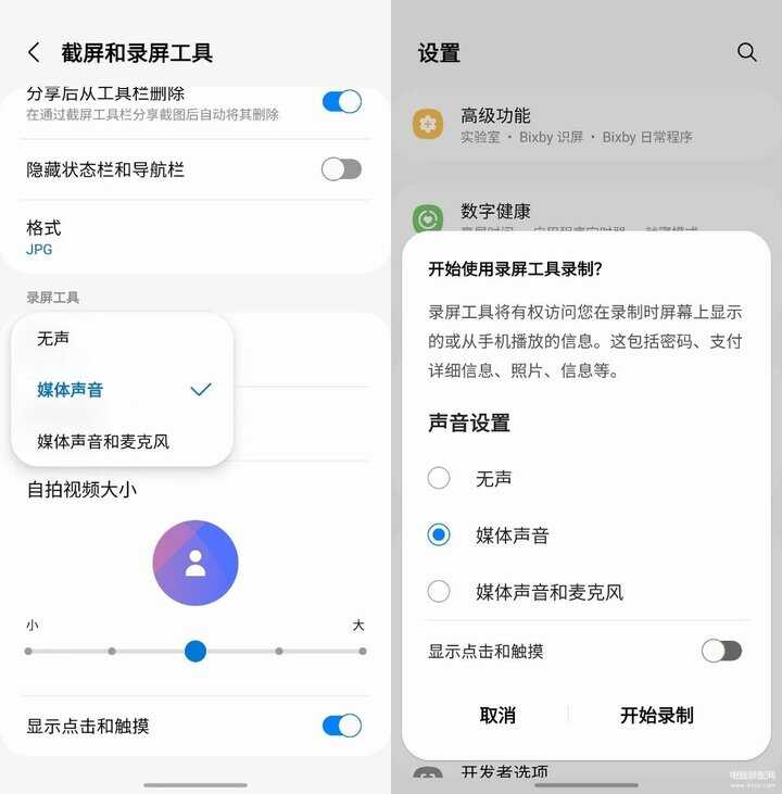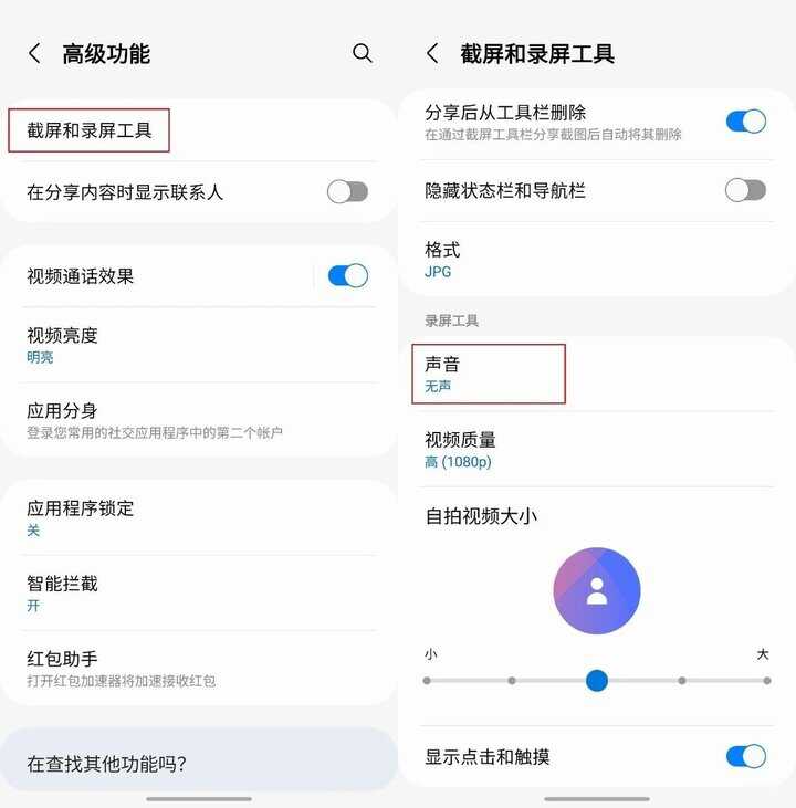 打开设置,进入“高级功能”,选择“截屏和录屏工具”,就能看到录屏工具中的声音设置,选项默认为“无声”,你可以设置为“媒体声音”、“媒体声音和麦克风”,媒体声音会包含手机里的声音,而后者则是包括手机里的声音以及麦克风的声音。