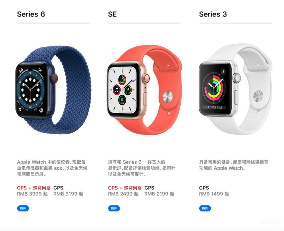 现在苹果官网在售的Apple Watch一共有三款,Apple Watch Series 6和Apple Watch SE都是在去年秋季发布会发布的产品,而官网还有一款Apple Watch Series 3,已经发布了4年。差价就从三千多一直到一千多都有的选择。