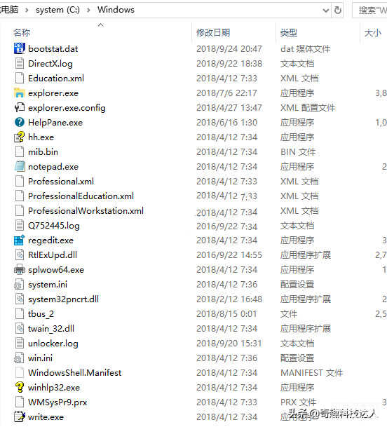 在Windows目录中,我们可以看到熟悉的软件,你的桌面,其实是一个软件,全名叫文件资源管理器,也就是explorer.exe,我们如果结束这个程序的进程,可能你的桌面就消失了。还有regedit.exe,注册表编辑器,notepad.exe,记事本等系统程序。
