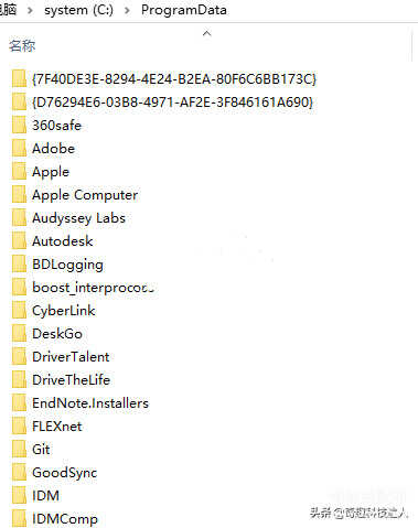 ProgramData目录位程序数据目录,这个目录是隐藏的,需要设置查看隐藏文件夹才能看到。这个目录也是垃圾文件的重灾区,很多程序的配置都在这儿,并且很多软件卸载后并没有删除配置,需要我们手动删除。