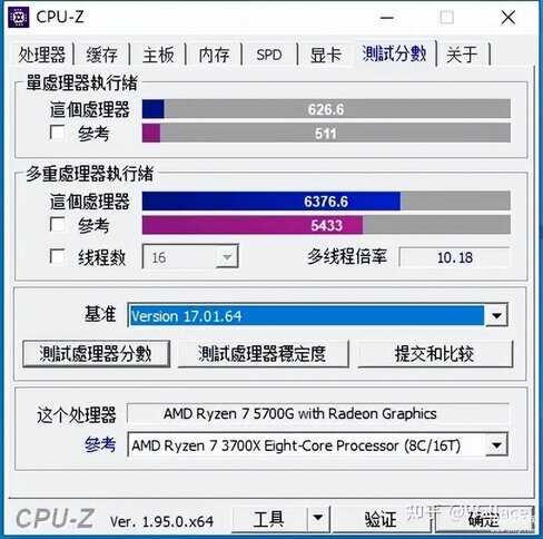 CPU-z多核/单核性能测试,在开启2档PBO的条件下,5700G的单核得分为626.2,多核心得分为6371.6,紫色部分是3700x的分数: