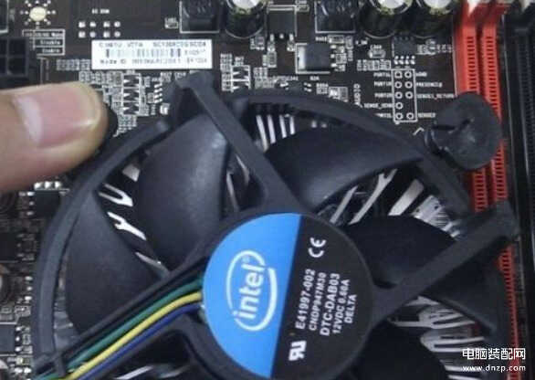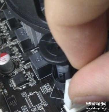 3、等风扇的四个角固定好在主板固定孔后,再把风扇四个角落的卡也压下去。