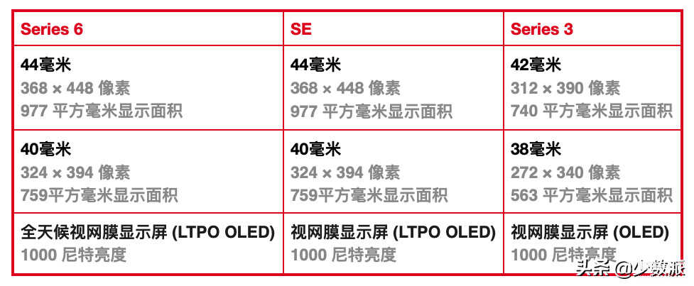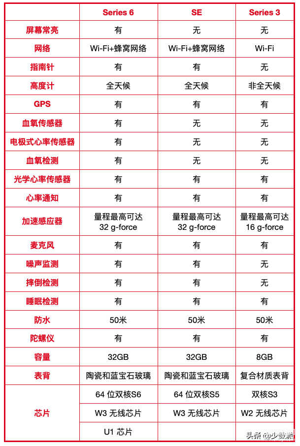 Series 6、SE 和 Series 3 的最大差异就是在于功能配置。在选购时,我们主要关注的就是网络和健康检测功能,这两项需求直接决定我们该选 Series 6、SE 还是 Series 3。先来看三款设备详细的功能与硬件区别。