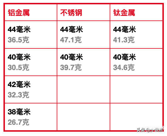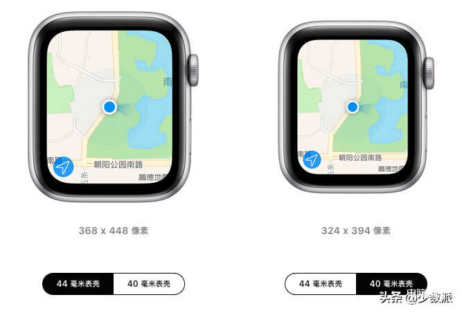任意一款 Apple Watch 都有两种不同的表壳尺寸,表壳的尺寸则直接决定了显示屏幕的大小。但是注意,尽管屏幕尺寸不同,它们的显示内容是同比例放大缩小的,只不过在屏幕较大的表盘上,图形、按钮等元素更大一些。