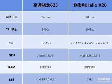 首先,我们先来对比一下高通骁龙625和联发科Helio X20的基本参数,让大家对于这两款处理器有一个初步的认识。
