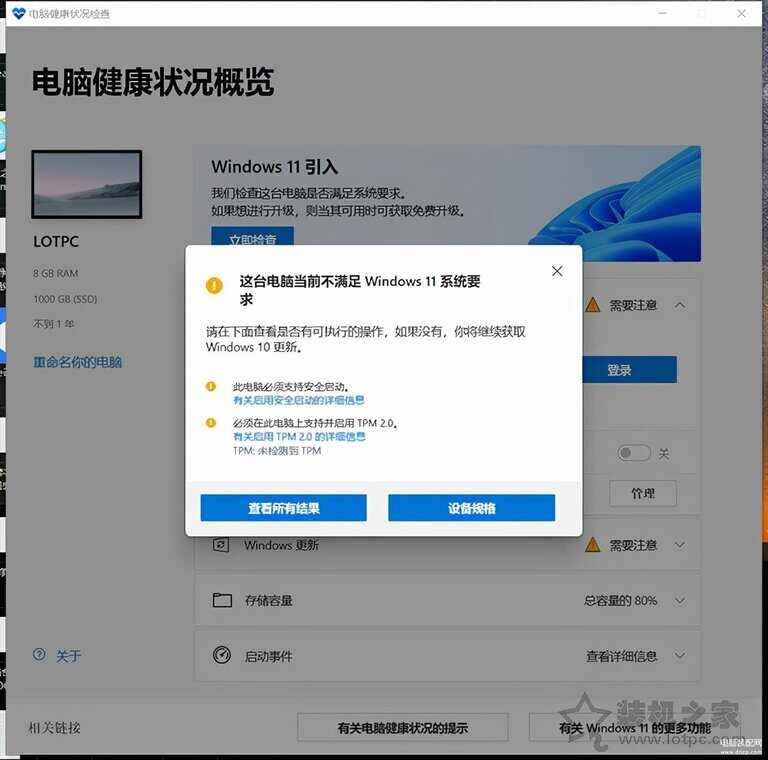 我们可以采用微软官方推出的“电脑健康状况检查”工具对自己电脑进行检测,来看看是否可以满足Win11系统的要求。如果提示这台电脑当前不满足Windows11系统要求,原因是“此电脑必须支持安全启动”和“必须在此电脑上支持并启用TPM2.0”,如下图所示。