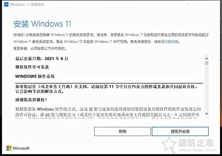 升级Win11系统不会对之前的软件、资料进行格式化操作,首先我们打开“Windows11安装助手”,点击“接受并安装”按钮,如下图所示。